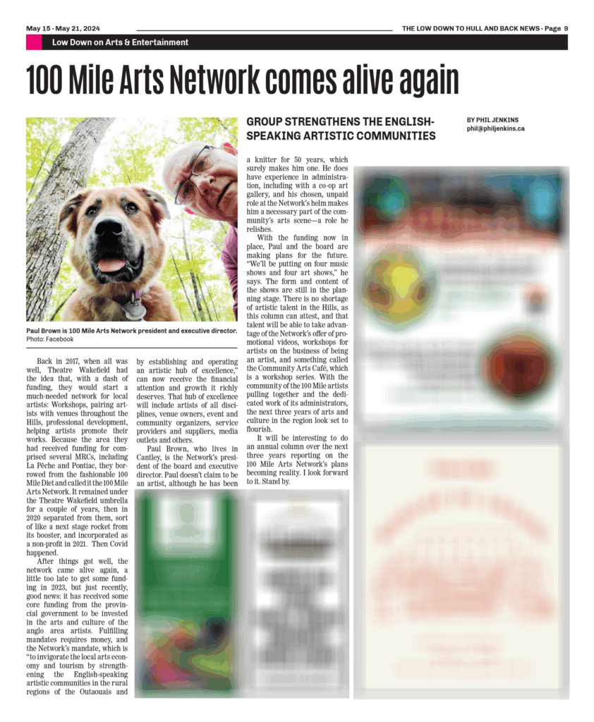 After things got well, the network came alive again. It was a little too late to get some funding in 2023, but just recently, there was good news: it has received some core funding from the provincial government to be invested in the arts and culture of the anglo area artists. Fulfilling mandates requires money, and the Network’s mandate, which is “to invigorate the local arts economy and tourism by strengthening the English-speaking artistic communities in the rural regions of the Outaouais and by establishing and operating an artistic hub of excellence,” can now receive the financial attention and growth it richly deserves. That hub of excellence will include artists of all disciplines, venue owners, event and community organizers, service providers and suppliers, media outlets and others.