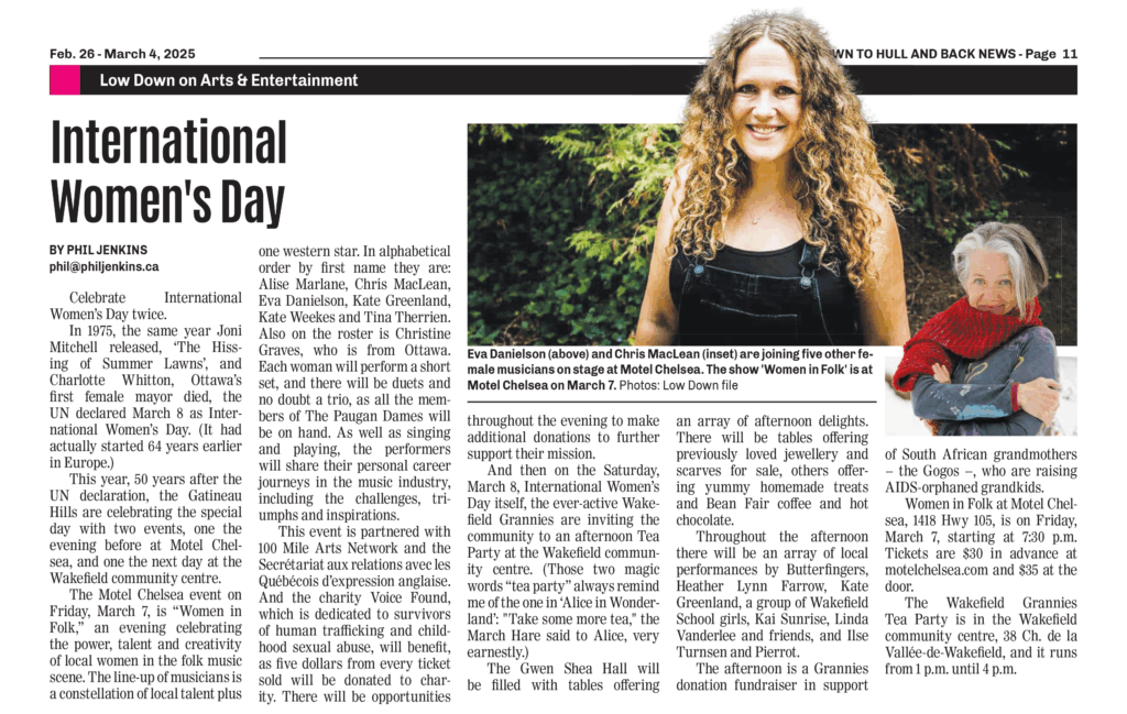 In 1975, the same year Joni Mitchell released, ‘The Hissing of Summer Lawns’, and Charlotte Whitton, Ottawa’s first female mayor died, the UN declared March 8 as International Women’s Day. (It had actually started 64 years earlier in Europe.) This year, 50 years after the UN declaration, the Gatineau Hills are celebrating the special day with two events, one the evening before at Motel Chelsea, and one the next day at the Wakefield community centre.