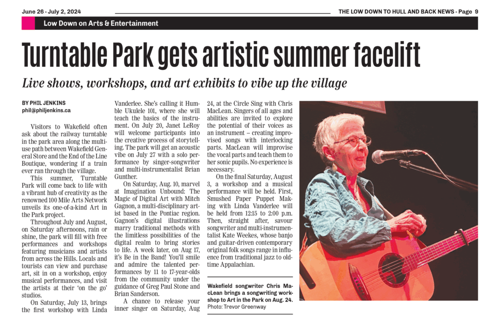 Visitors to Wakefield often ask about the railway turntable in the park area along the multiuse path between Wakefield General Store and the End of the Line Boutique, wondering if a train ever ran through the village. This summer, Turntable Park will come back to life with a vibrant hub of creativity as the renowned 100 Mile Arts Network unveils its one-of-a-kind Art in the Park project.